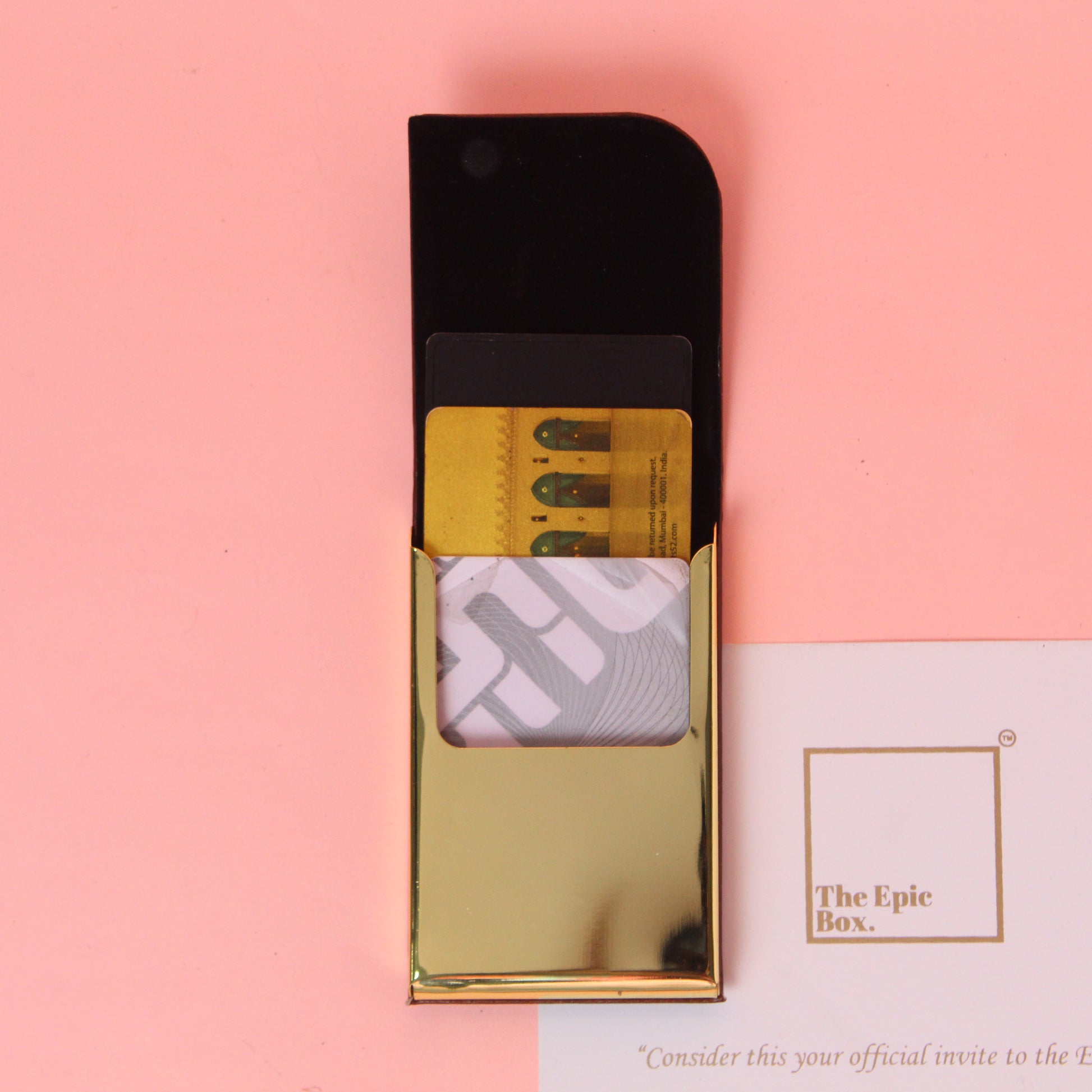 - Cardholder crafted with rich brown leatherette and a sleek gold metal base