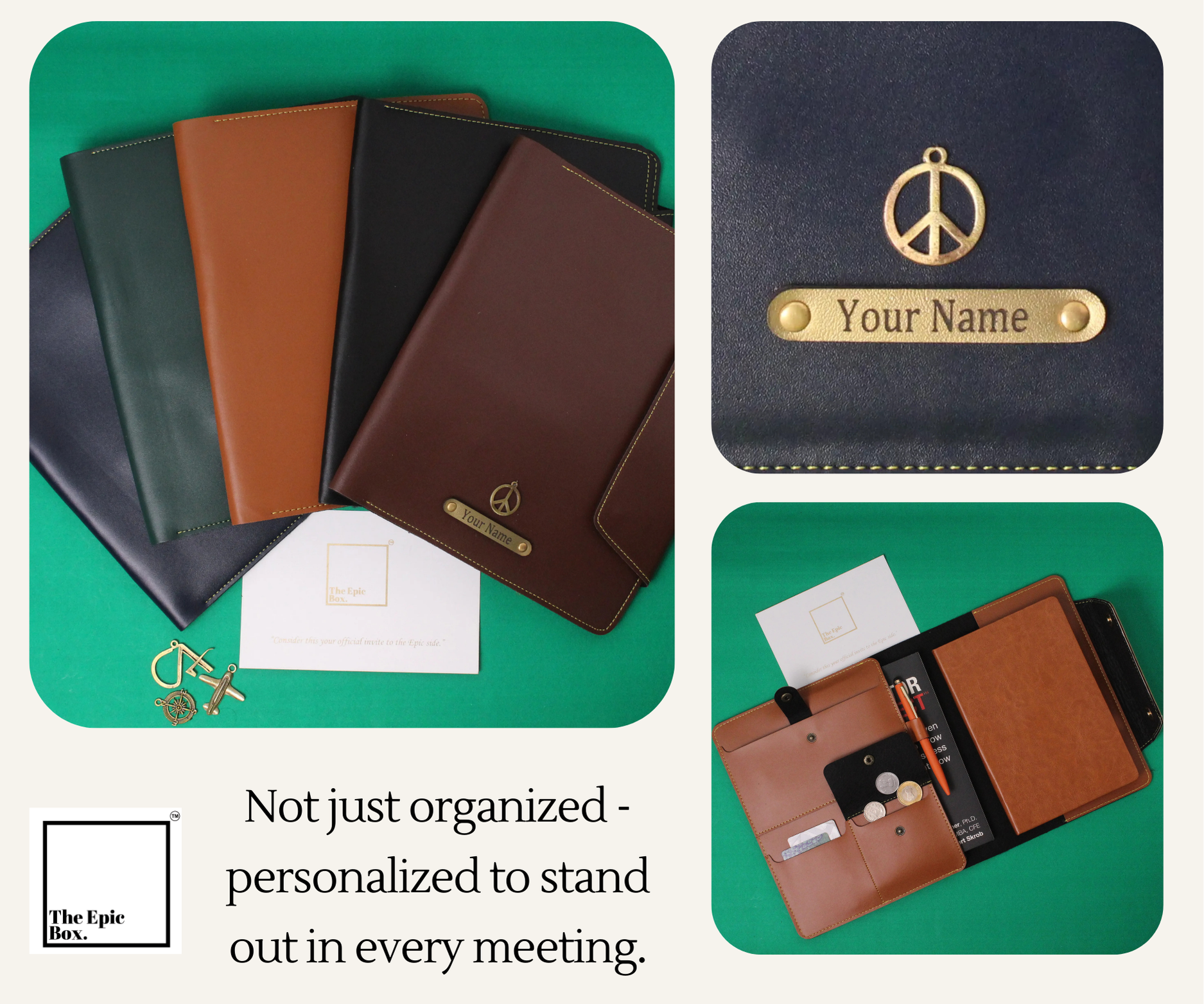 Elevate your workday with this premium vegan leather office organizer, thoughtfully designed to keep your essentials in place. From your phone and cards to documents and pens, every item has a designated space. Personalize it with your name and a charm of your choice to make it uniquely yours. A perfect companion for meetings, travel, or daily organization – where style meets productivity.