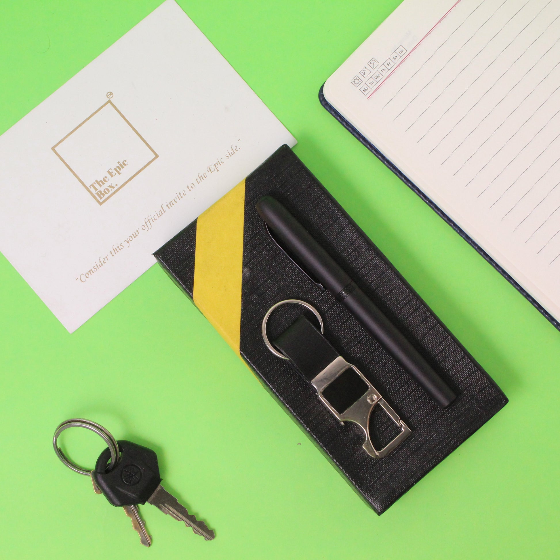 Includes 1 premium matte black pen and 1 leather-metal keychain