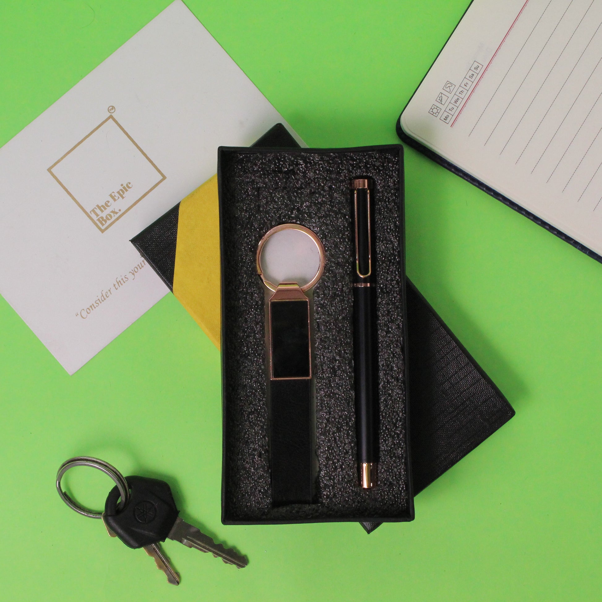 This personalized gift set blends classic charm with daily utility. The timeless black-rose gold pen and matching keychain, engraved to perfection, are housed in an elegant box—crafted to delight and destined to impress.