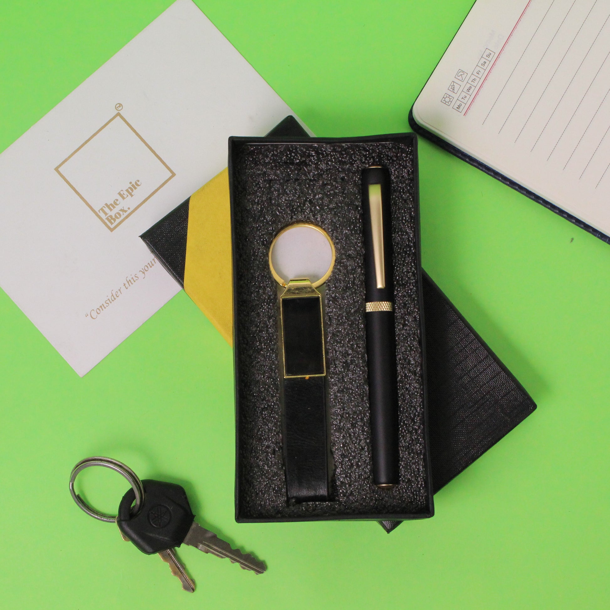 - Includes 1 sleek black-gold pen and 1 matching keychain