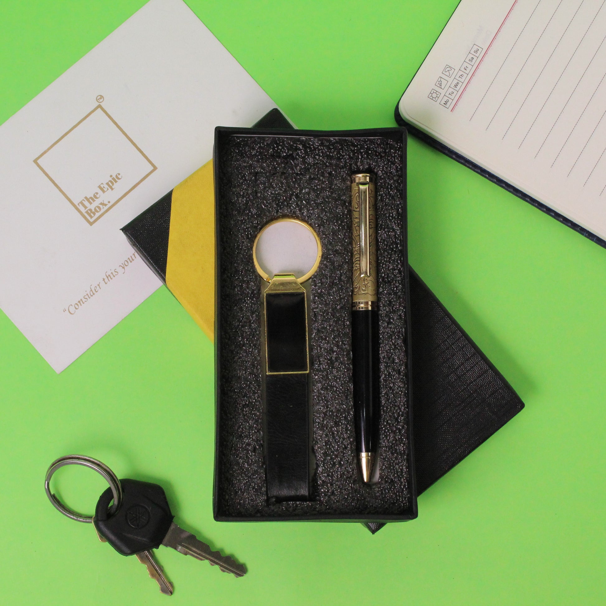 - Includes 1 premium gold-accent pen and 1 gold-detailed keychain