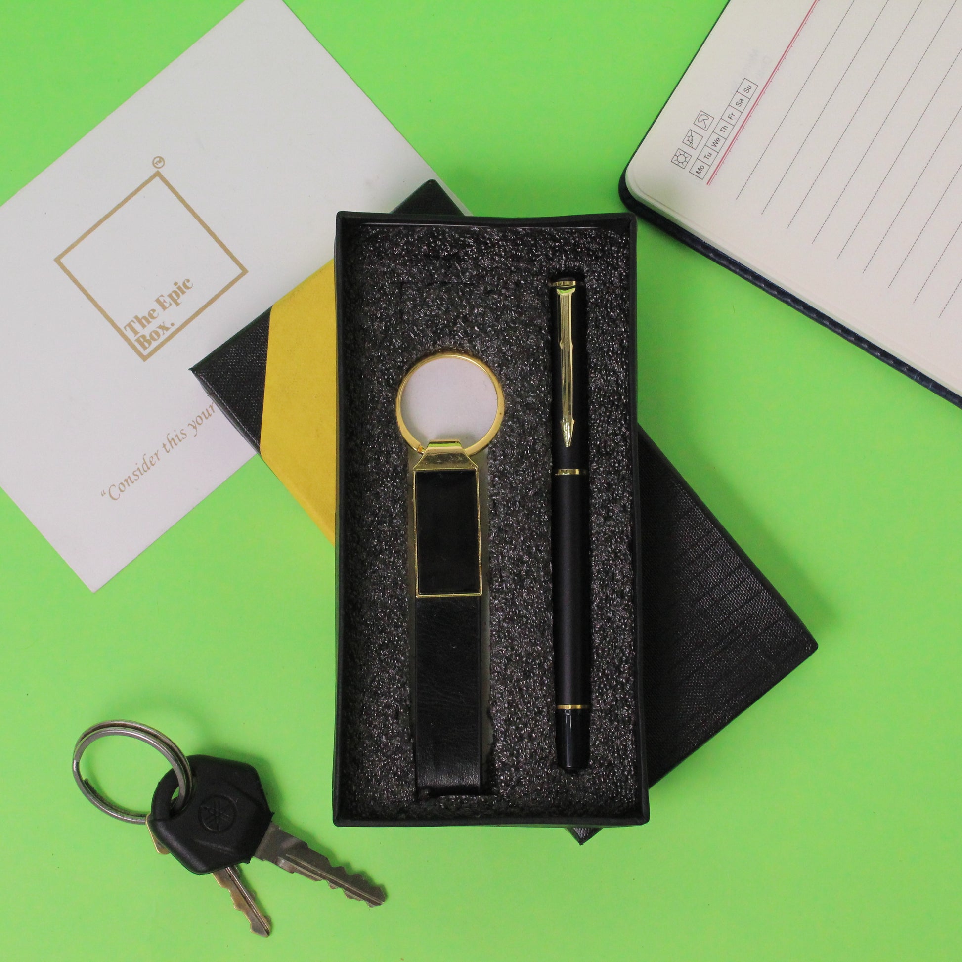 - Includes 1 sleek black-gold pen and 1 matching keychain