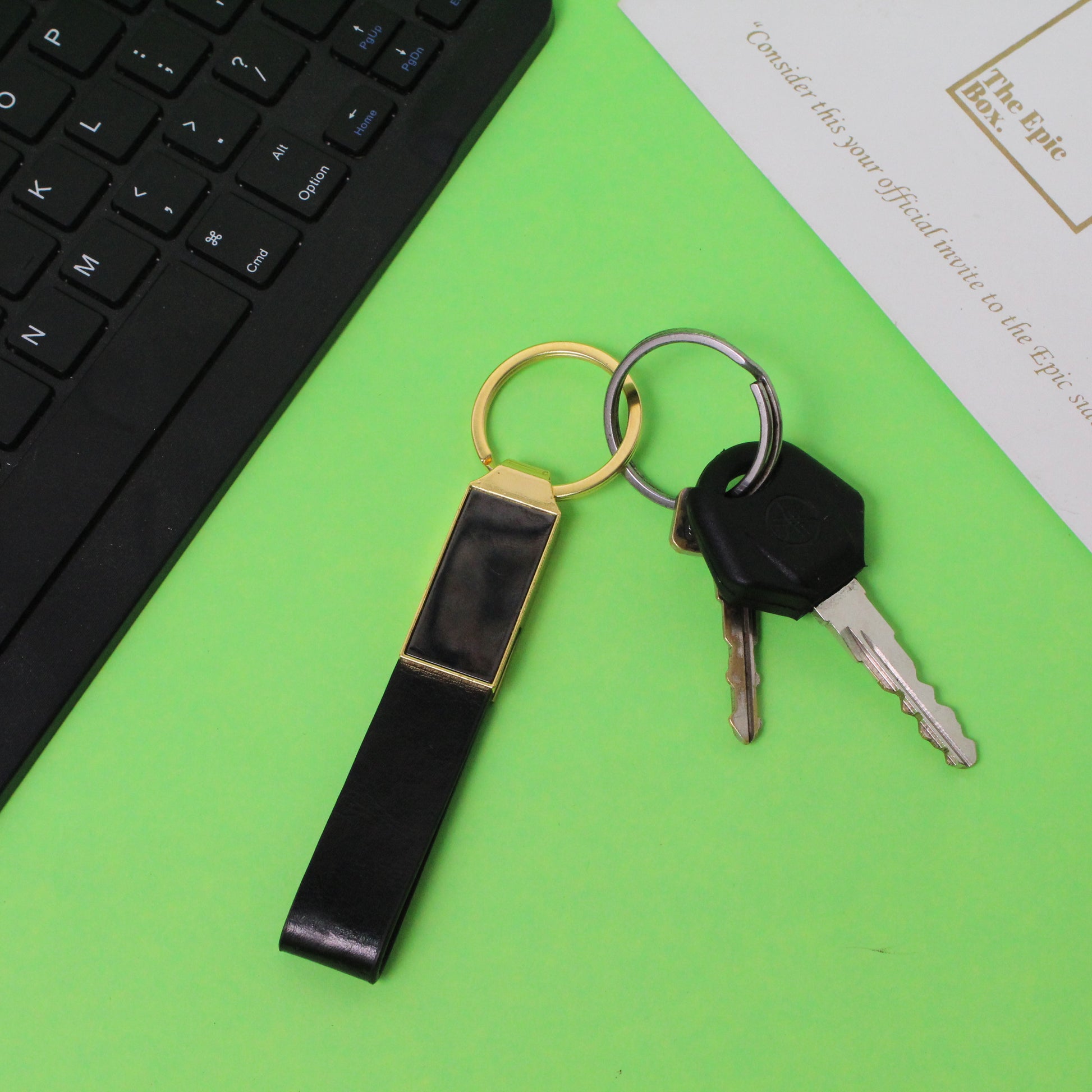 - Keychain crafted from premium black leather and gold-tone metal